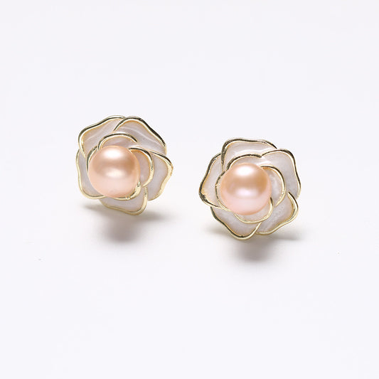 Genuine Freshwater Pearl Solid S925 Golden Rose Earrings