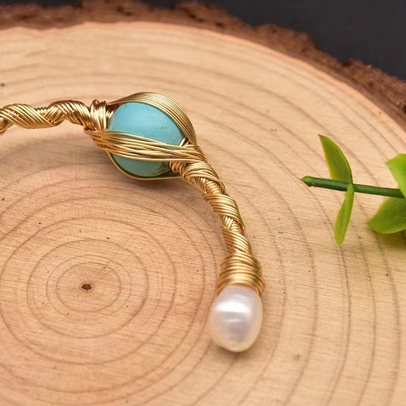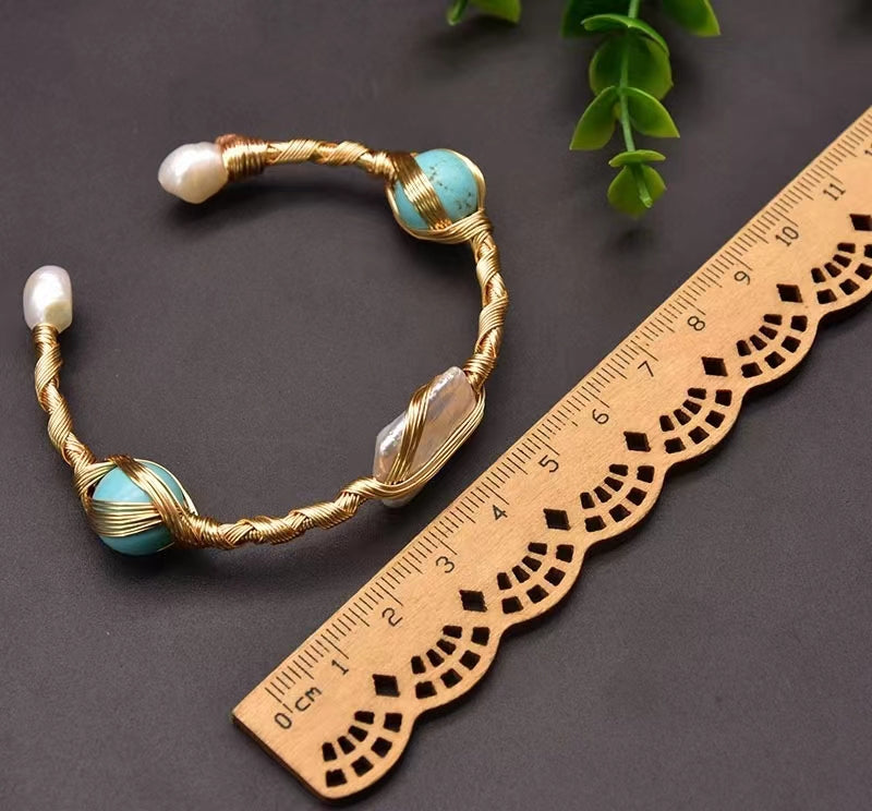This limited edition bracelet features genuine Freshwater Baroque Pearls with 2 stunning genuine turquoise, expertly woven together with a gleaming gold string. An exquisite piece of jewelry for any occasion.