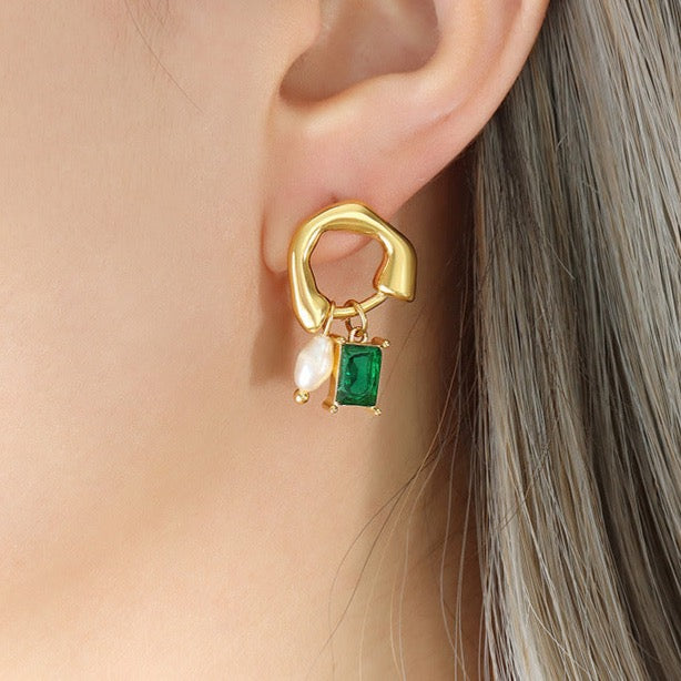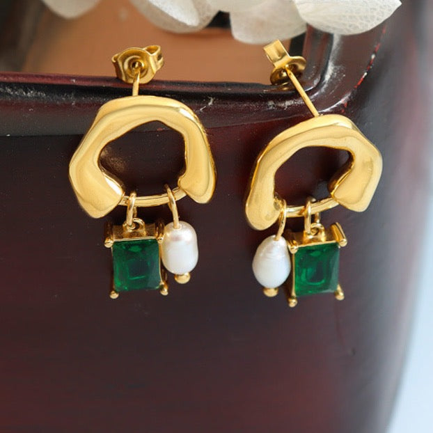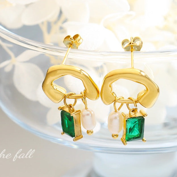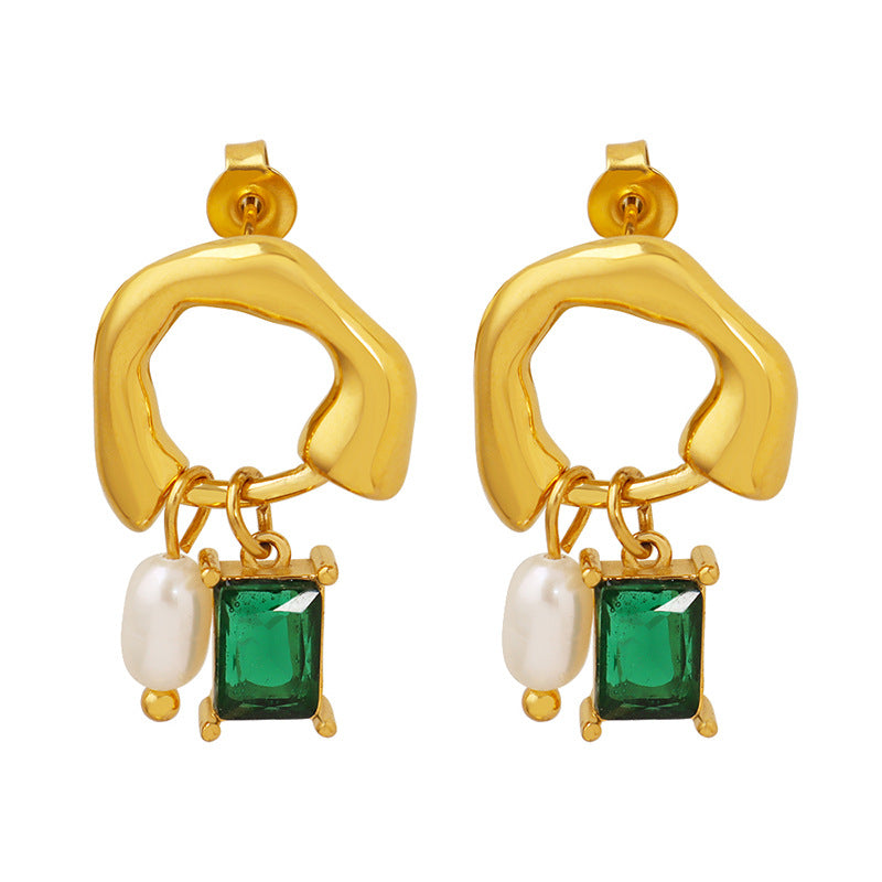 Genuine Freshwater Pearl Titanium Steel Green Dewdrop Earrings