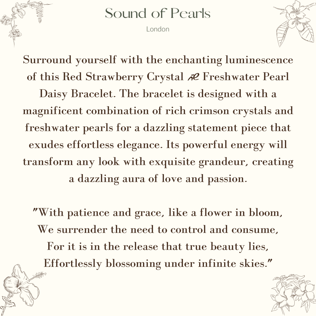 Surround yourself with the enchanting luminescence of this Red Strawberry Crystal & Freshwater Pearl Daisy Bracelet. The bracelet is designed with a magnificent combination of rich crimson crystals and freshwater pearls for a dazzling statement piece that exudes effortless elegance. Its powerful energy will transform any look with exquisite grandeur, creating a dazzling aura of love and passion.